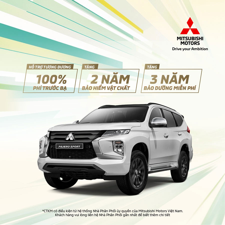 Không dừng lại ở đó, chúng tôi cũng mang đến những ưu đãi đặc biệt cho dòng xe Pajero Sport, với gói hỗ trợ lên đến 100% lệ phí trước bạ, hai năm bảo hiểm vật chất và gói bảo dưỡng miễn phí kéo dài đến ba năm hoặc 60.000 km.