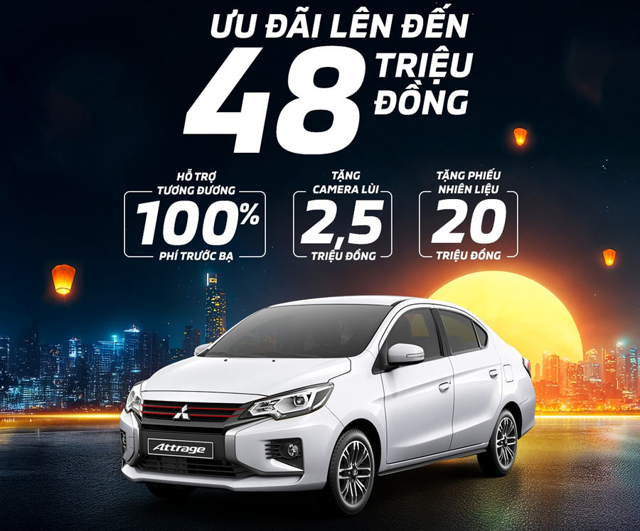 | Attrage CVT Premium | 50% LPTB (~24,5 triệu) + Phiếu nhiên liệu (20 triệu) + Ăng-ten vây cá (1,5 triệu) |